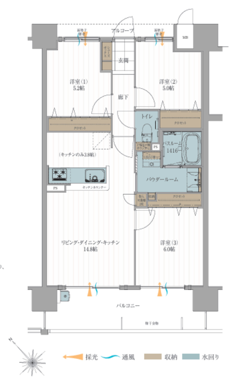 間取り 3LDK 洋6帖・5.2帖・5帖 LDK14.8帖(キッチン部分3.8帖)